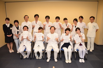 過日の臨床研修修了式において、 院長先生より一人ひとりに修了証が授与されました。 研修修了おめでとうございます! 最後に記念撮影。 2年前の初々しい顔からしっかりお医者さんの顔に変わっています。 この病院で過ごした時間がこれからの医師人生において 深く記憶に残ることを信じて見送りたいと思います。